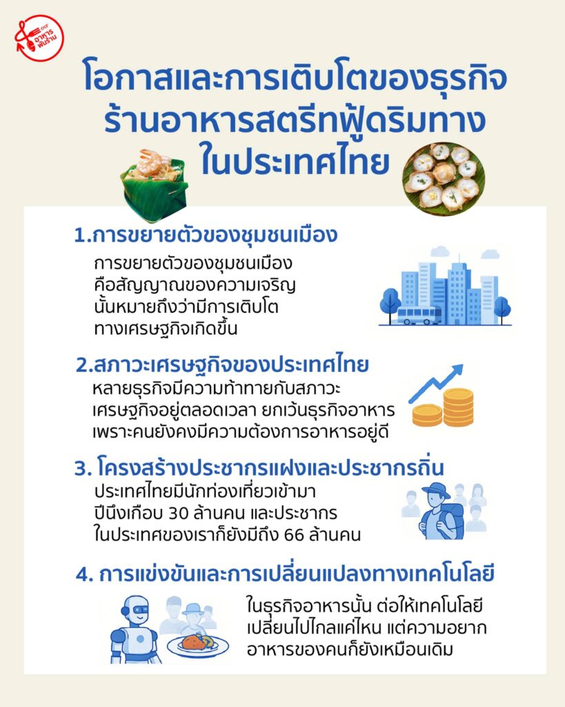 ธุรกิจร้านอาหาร street food ยังคงเป็นหนึ่งในธุรกิจที่มีแนวโน้มเติบโตได้อย่างต่อเนื่องในประเทศไทย ไม่ว่าจะด้วยปัจจัยด้านการขยายเมือง สภาวะเศรษฐกิจ โครงสร้างประชากร หรือแม้แต่กระแสเทคโนโลยีที่เปลี่ยนแปลงไป